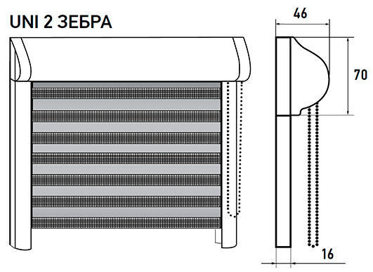 - Подъем и опускание тканевого полотна осуществляется посредством цепи управления, проходящей через механизм управления барабанного типа, который может располагаться слева или справа в верхней намоточной трубе.
